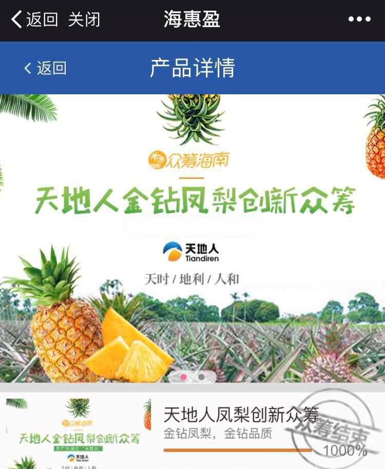 3月22日,海南股權交易中心天地人鳳梨創新眾籌項目圓滿結束,計劃眾籌金額10萬元,項目上線僅5分鐘,成功募集金額100萬元,是預期目標金額的10倍。天地人鳳梨眾籌項目,是股交中心2018年在海惠盈平臺上線的首單創新...