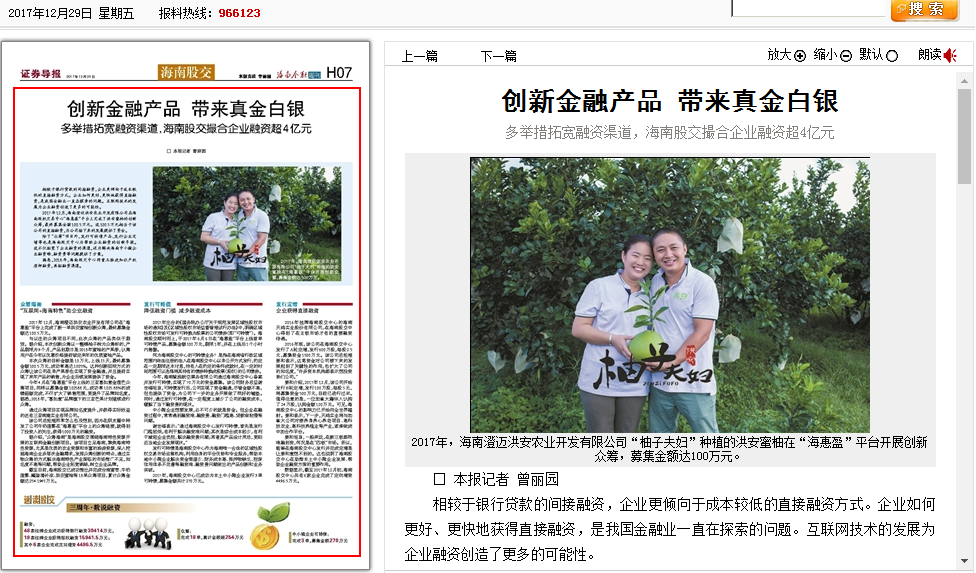 在海南股權交易中心成立三周年之際,證券導報以四個版面整版報道海南股權交易中心,關注股交中心三年以來的發展。其中,通過一個版面的報道——《創新金融產品帶來真金白銀》,解讀了股交中心幫助企業實現融資的各項...