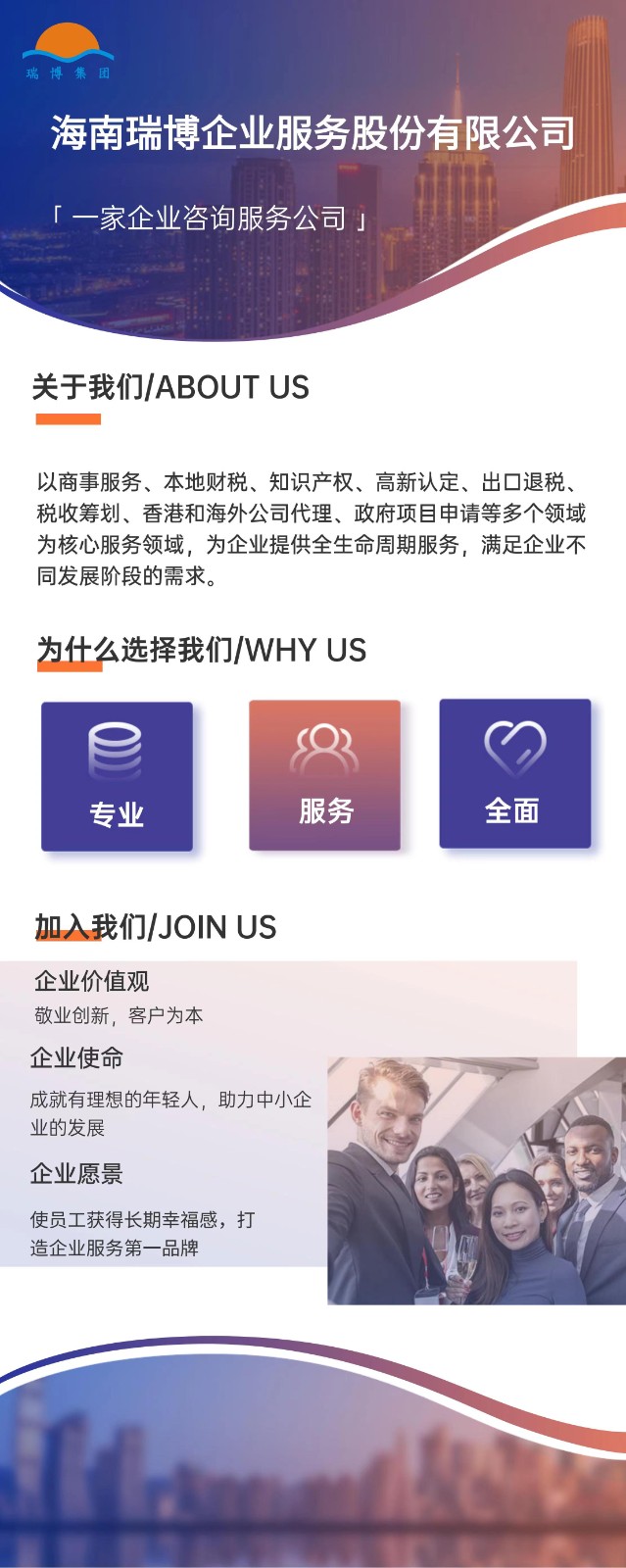 | 企業(yè)說(shuō)明: | 海南瑞博企業(yè)服務(wù)股份有限公司是瑞博集團(tuán)下屬子公司,自2018年海南自貿(mào)港開(kāi)放以來(lái)。瑞博集團(tuán)積極響應(yīng)國(guó)家的號(hào)召,通過(guò)充分考察后,于海南省海口市成立海南瑞博企業(yè)服務(wù)股份有限公司,主要以商事服務(wù)、本地財(cái)稅、知識(shí)產(chǎn)權(quán)、高新認(rèn)定、出口退稅、稅收籌劃、香港和海外公司代理、政府項(xiàng)目申請(qǐng)等多個(gè)領(lǐng)域?yàn)楹诵姆?wù)領(lǐng)域,為企業(yè)提供全生命周期服務(wù),滿(mǎn)足企業(yè)不同發(fā)展階段的需求。 瑞博集團(tuán)下屬直營(yíng)子公司分部在北京、西安、海南、香港等地,全國(guó)主要一二線(xiàn)城市的分部陸續(xù)成立中,跨區(qū)域配合,輻射全國(guó),以滿(mǎn)足客戶(hù)跨區(qū)域服務(wù)需求;同時(shí)瑞博持續(xù)拓展延伸資源合作平臺(tái),引入各類(lèi)商業(yè)服務(wù)機(jī)構(gòu)供應(yīng)鏈合作機(jī)構(gòu),打通了產(chǎn)業(yè)鏈上下游領(lǐng)域的立體服務(wù)生態(tài),企業(yè)全品類(lèi)服務(wù)能力,得到了廣大的客戶(hù)的認(rèn)可與信賴(lài)。 |