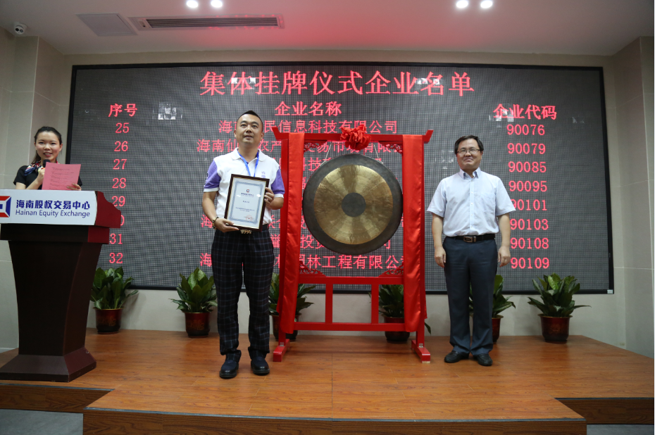 儀式現(xiàn)場,37家掛牌企業(yè)代表一一上臺鳴鑼并接受掛牌證書。海南中匯創(chuàng)業(yè)投資管理有限公司、海南維特律師事務(wù)所和海南信天源投資有限公司因在推薦企業(yè)掛牌股交中心方面的積極表現(xiàn)獲得了第二季度優(yōu)秀推薦機(jī)構(gòu)的表彰。