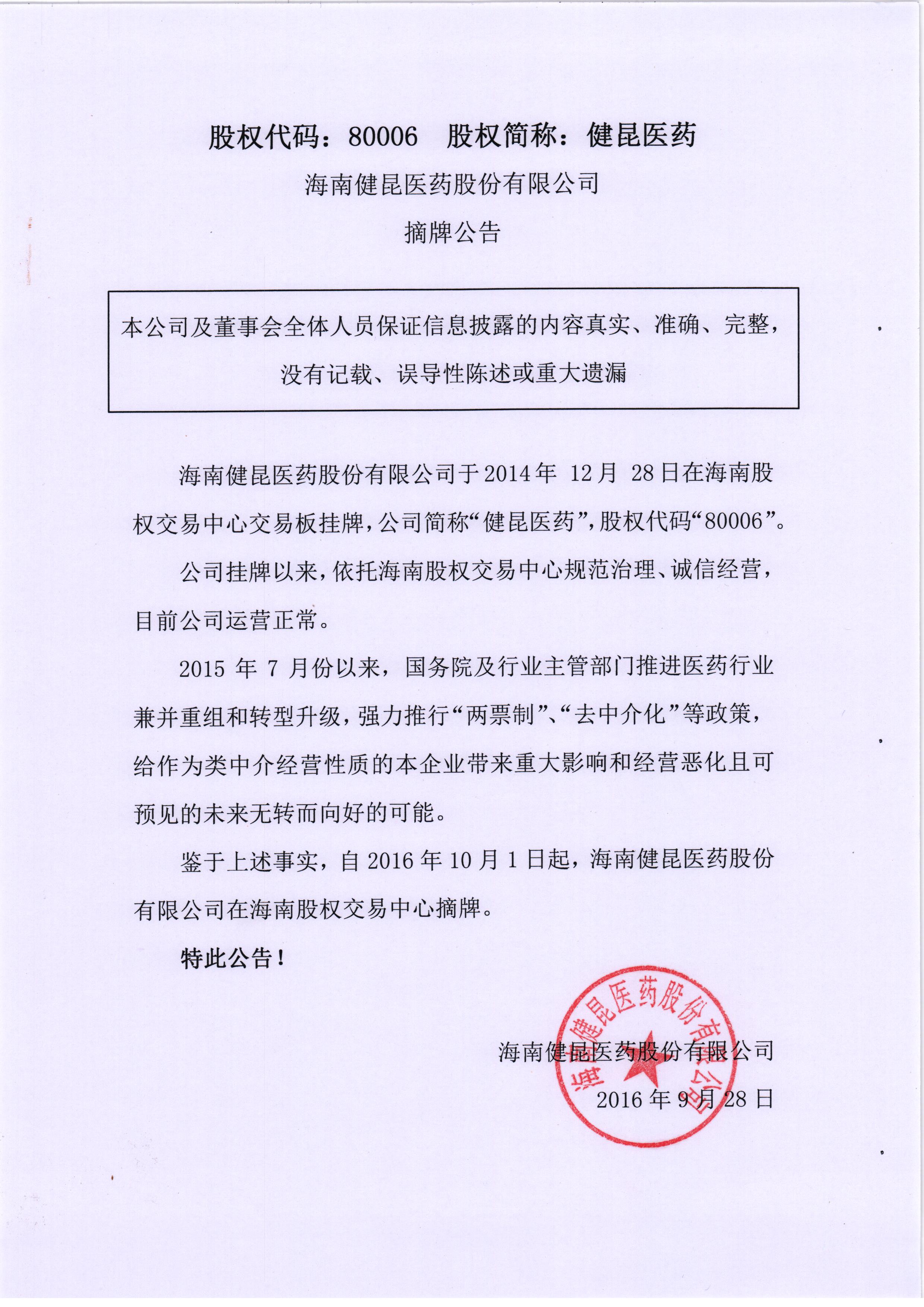 80006 健昆醫藥:海南健昆醫藥股份有限公司摘牌公告