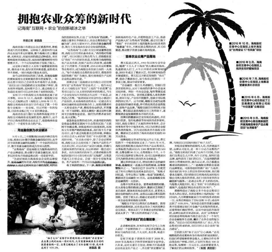 中國(guó)人民銀行唯一直屬刊物《金融時(shí)報(bào)》近整版報(bào)道了海南股權(quán)交易中心“眾籌海南”項(xiàng)目,文章以《擁抱農(nóng)業(yè)眾籌的新時(shí)代 記海南“互聯(lián)網(wǎng)+農(nóng)業(yè)”的創(chuàng)新破冰之舉》為題,圍繞數(shù)字普惠金融、“互聯(lián)網(wǎng)+農(nóng)業(yè)”創(chuàng)新等內(nèi)容展開。