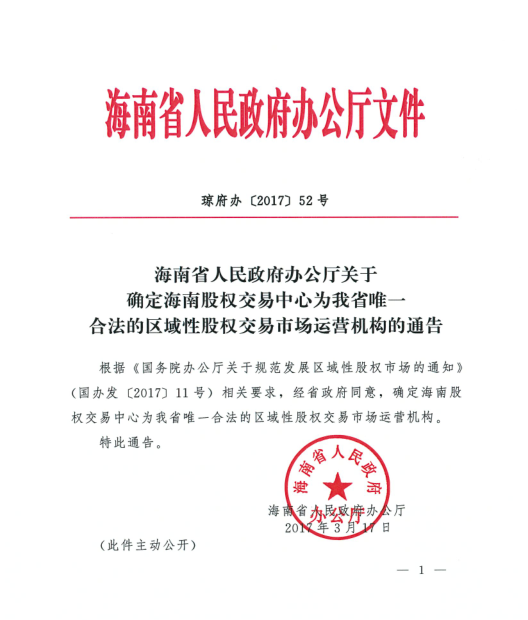 海南省人民政府辦公廳關于確定海南股權交易中心為我省唯一合法的區域性股權交易市場運營機構的通告