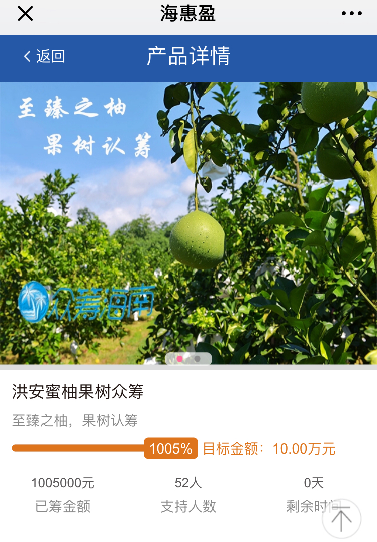 去年底,為了幫助企業(yè)解決短期資金流轉(zhuǎn)問題,海南股權(quán)交易中心聯(lián)合掛牌企業(yè)澄邁洪安農(nóng)業(yè)開發(fā)有限公司發(fā)起了存續(xù)期為9個(gè)月的“洪安蜜柚果樹眾籌”項(xiàng)目,項(xiàng)目在股交中心綜合金融服務(wù)平臺“海惠盈”發(fā)布后短時(shí)間內(nèi)達(dá)成了募集資金目標(biāo),最終募集金額達(dá)100.5萬元。