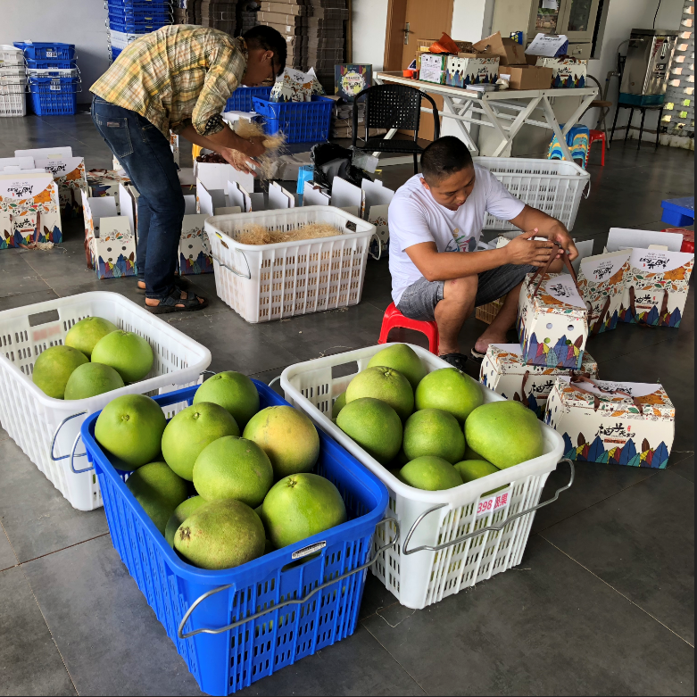 夏樹蒼翠,驕陽似火,烈日炎炎下洪安莊園的工人們依舊熱情飽滿的對采摘下來的蜜柚一一進(jìn)行稱重、分類、打包和入庫。