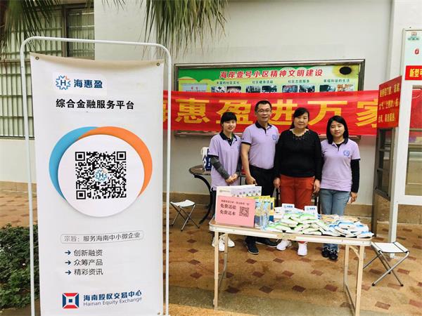 近日,為滿足社區居民日益增長的金融服務需求,不斷拉近海南股交與社區居民的距離,海南股交投資者服務中心聯合海惠盈團隊開展了“海惠盈進萬家”戶外營銷活動。在加深與社區居民感情交流的同時,推進海惠盈社區金融服務,將海惠盈產品送到市民家門口,為海南股交后期的產品路演打下良好基礎,讓社區居民感受海南股交貼心的服務。