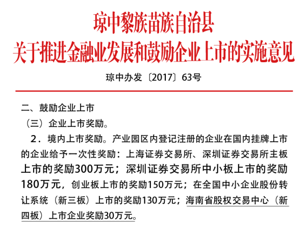 為扶持中小微企業對接資本市場,鼓勵企業上市、掛牌和融資。瓊中縣政府印發《瓊中黎族苗族自治縣關于推進金融業發展和鼓勵企業上市的實施意見》(瓊中辦〔2017〕63號),意見指出,對在區域性股權交易市場掛牌的瓊中縣注冊登記的企業,給予一次性獎勵30萬元(適用于完成股改并在海南股交交易板掛牌的瓊中縣企業)。