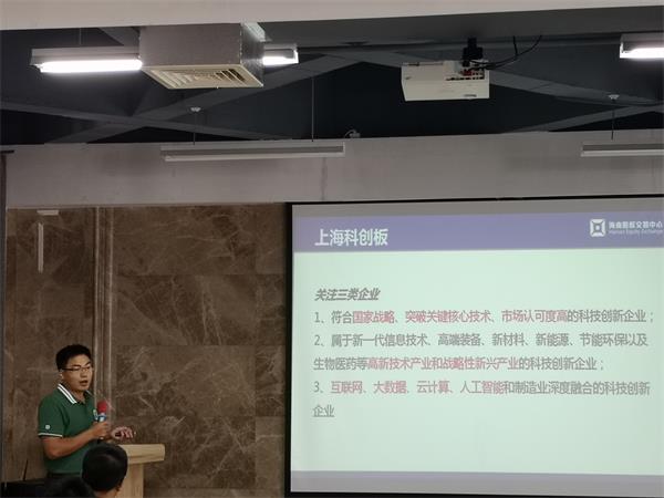 在培訓環節,公司機構合作部負責人為到訪企業介紹了上交所科創板的設立目的、市場定位、上市指標及上市意義。他表示,為更好的服務本省高新技術企業和科技型企業,公司去年聯合海南省科技廳設立了科創板,目的是提供現代化金融服務助力海南高新技術企業和科技型企業轉型、升級。幫助企業優化治理、規范發展,推動企業對接更高資本市場,為企業登陸上交所科創板蓄力。