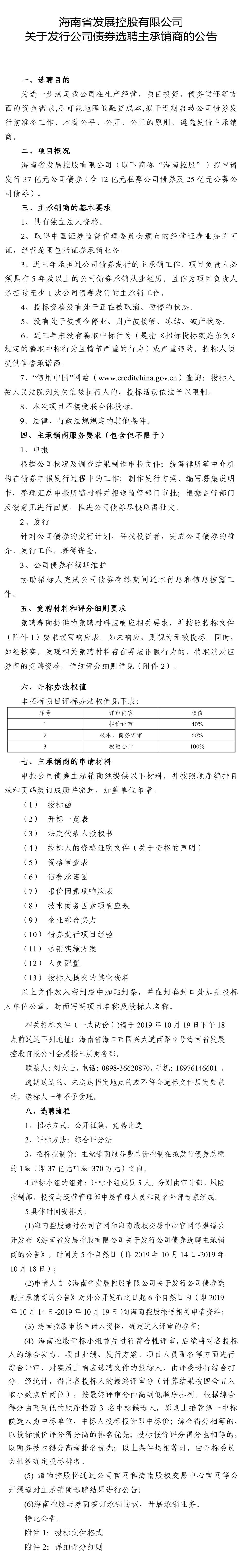 海南省發(fā)展控股有限公司關(guān)于發(fā)行公司債券選聘主承銷(xiāo)商的公告