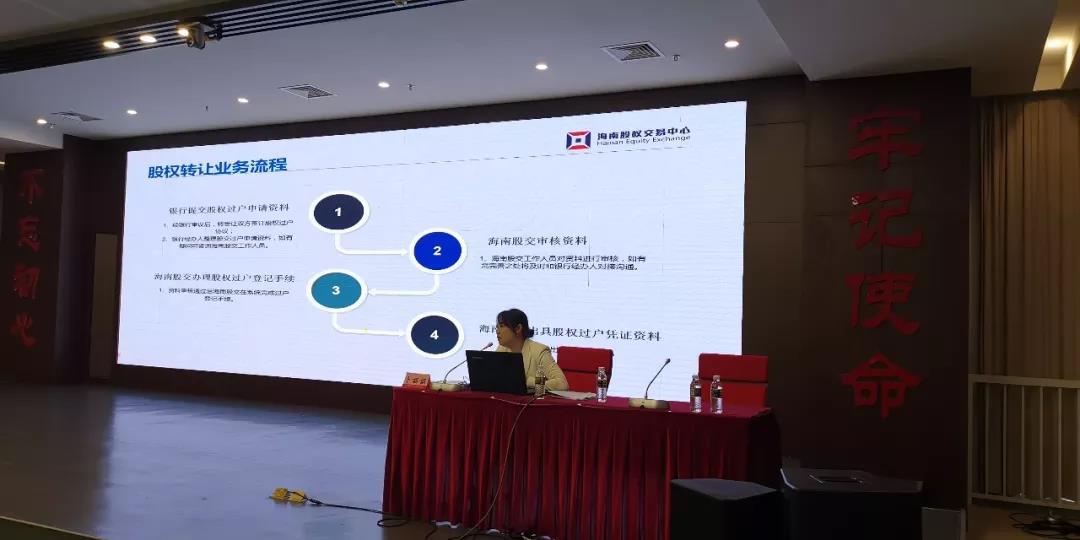 培訓會上,海南股交總經理助理卜麗麗向現場參會人員介紹了商業銀行股權登記托管的重要性和必要性。她表示,股權登記托管是區域性股權交易市場的一項基礎工作,也是主要業務之一。海南股交作為省內唯一合法的區域性股權交易市場運營機構,成立至今,股權托管企業共計90家,托管總股本達67.05億股,積累了豐富的股權托管工作經驗。2018年,海南銀行股份有限公司在海南股交成功辦理股權登記托管手續,成為省內首家完成股權登記托管的法人銀行,標志著海南省銀行股權登記托管業務實現零的突破。