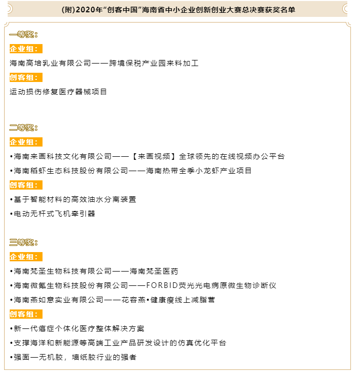 逐夢自貿港,創贏海之南。8月26日下午,由海南省工業和信息化廳、海南省財政廳主辦,海南股權交易中心承辦、深圳證券信息有限公司、陵水互聯網創業產業園協辦的2020年“創客中國”海南省中小企業創新創業大賽總決賽暨項目融資路演在海口舉行。通過2天近15個小時的路演和現場答辯,30強項目現場PK、同臺競技,最終,“跨境保稅產業園來料加工”和“運動損傷修復醫療器械”項目分獲海南賽區決賽企業組和創客組一等獎。