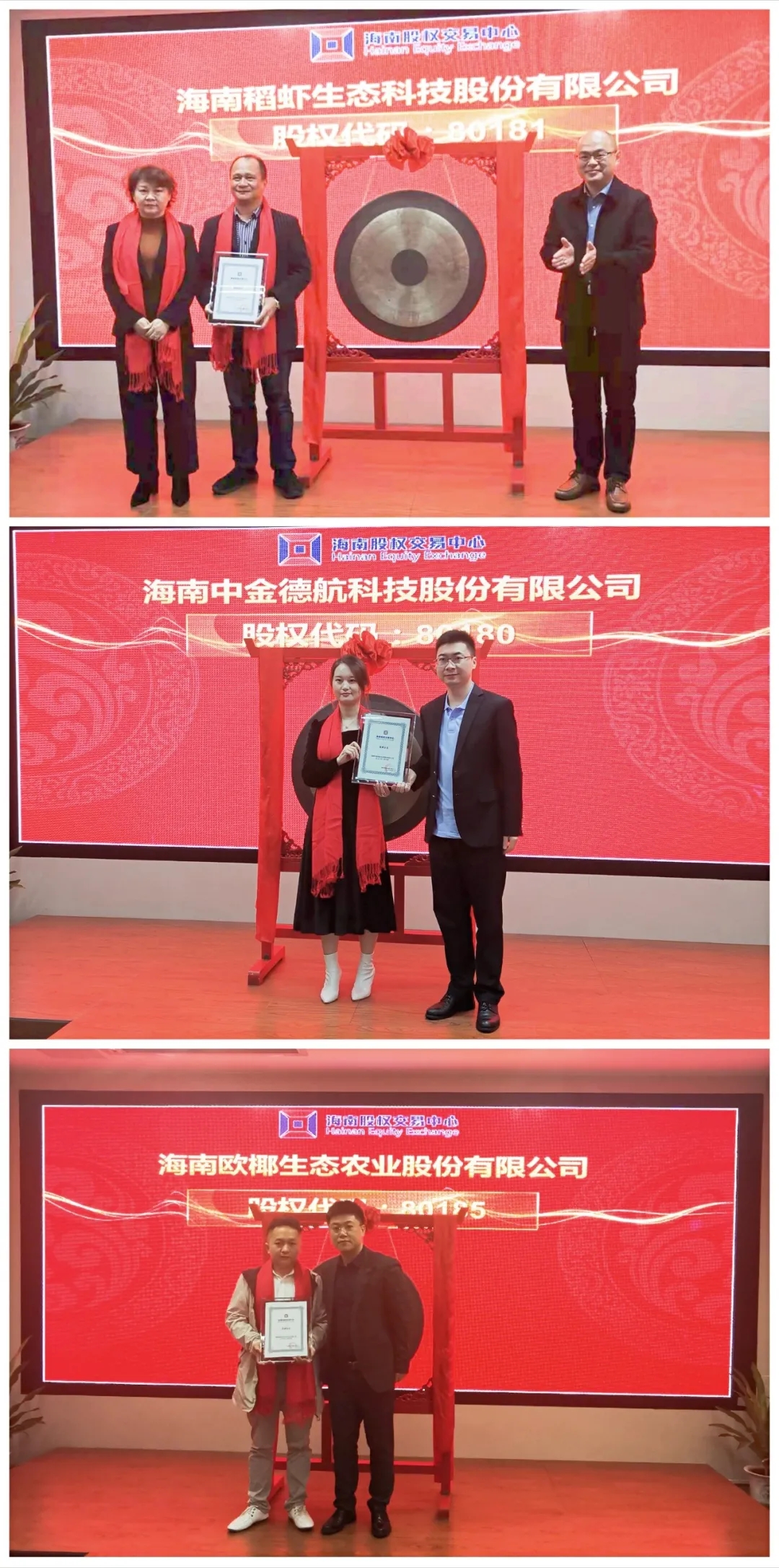 在企業集體掛牌儀式上,海南稻蝦生態科技股份有限公司、海南中金德航科技股份有限公司、海南歐椰生態農業股份有限公司等3家優質企業敲響了掛牌的鑼聲,正式登陸海南股交交易板。海南股交作為多層次資本市場的重要一環,將竭力為掛牌企業提供融資、規范、培育等多方面的服務,為企業對接多層次資本市場打下堅實的基礎。