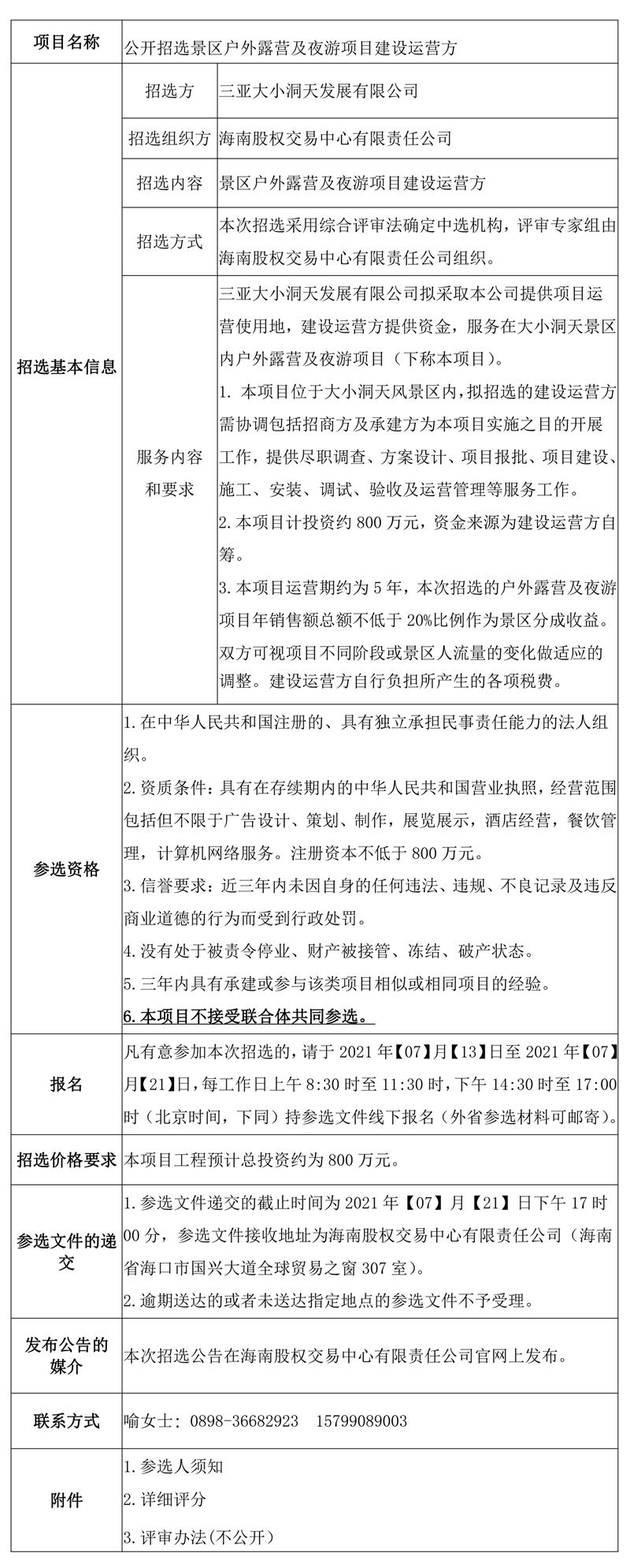 根據相關法律法規,受委托,海南股權交易中心有限責任公司公開招選景區戶外露營及夜游項目建設運營方,為三亞大小洞天景區的戶外露營及夜游項目提供盡職調查、方案設計、項目報批、項目建設、施工、安裝、調試、驗收及運營管理等服務工作。歡迎符合條件的機構遵照本公告的有關規定報名參加,現將有關事項公告如下:
