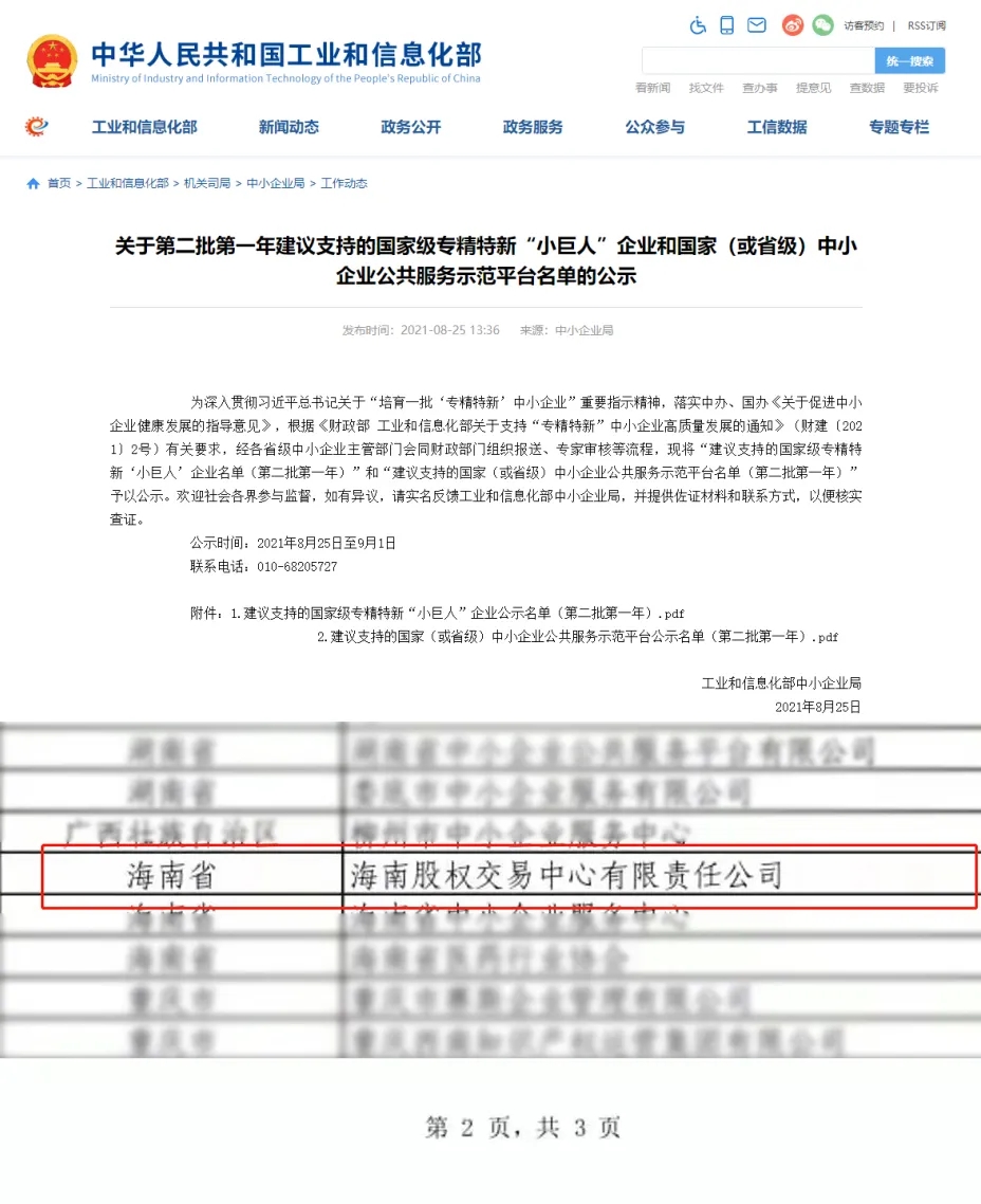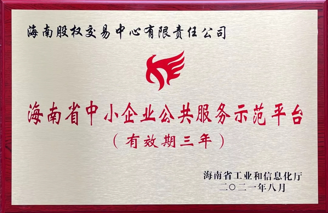 2021年8月,海南股交入選第二批“建議支持的國家(或省級)中小企業(yè)公共服務示范平臺”名單。證明了海南股交服務“專精特新”中小企業(yè)的能力獲得了工信部及省工信廳的認可。