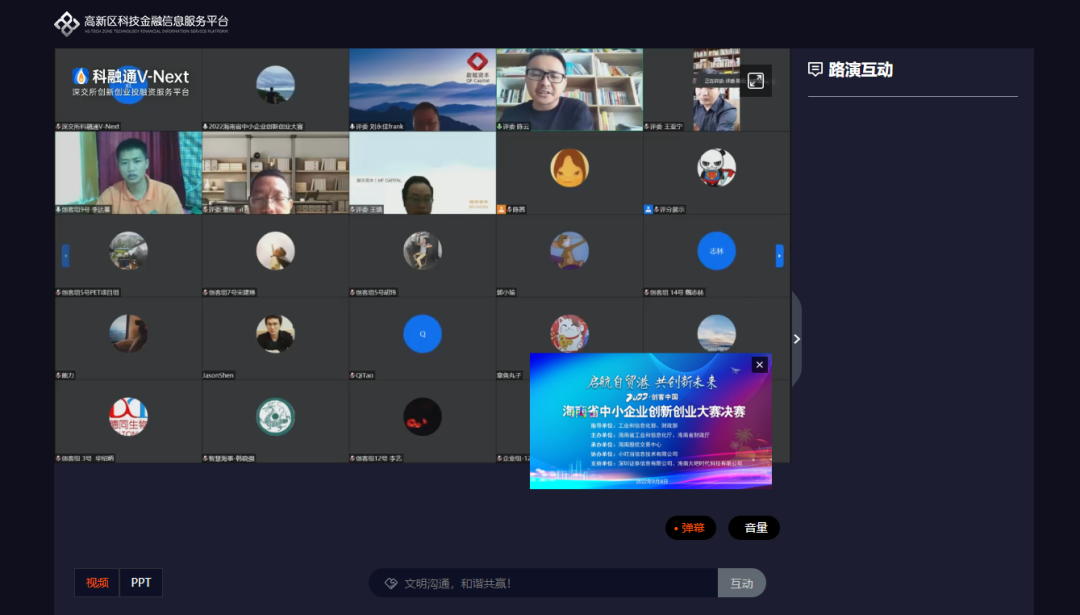 根據(jù)海南疫情防控需要,為降低傳播風(fēng)險(xiǎn),切實(shí)將各項(xiàng)防控措施落實(shí)到位,海南賽區(qū)決賽首次采取“線上路演+遠(yuǎn)程評(píng)審”的模式進(jìn)行,路演企業(yè)及評(píng)委登錄騰訊會(huì)議室,全程線上路演及答辯。值得一提的是,決賽路演同步登錄深交所科融通平臺(tái),直面全國7300多家主流的創(chuàng)投機(jī)構(gòu)和2500多家上市公司。