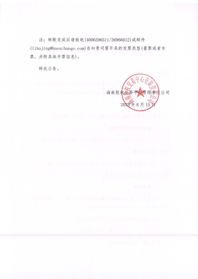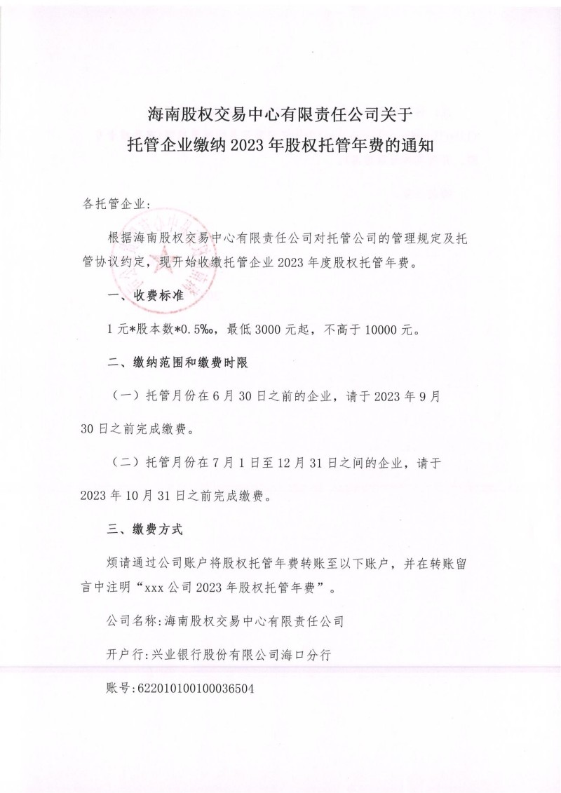 海南股權(quán)交易中心有限責(zé)任公司關(guān)于托管企業(yè)繳納2023年股權(quán)托管年費的通知