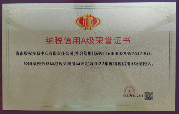 近日,在國家稅務(wù)總局澄邁縣稅務(wù)局納稅信用等級評定工作中,海南股交獲得“2022年度納稅信用A級納稅人”榮譽。