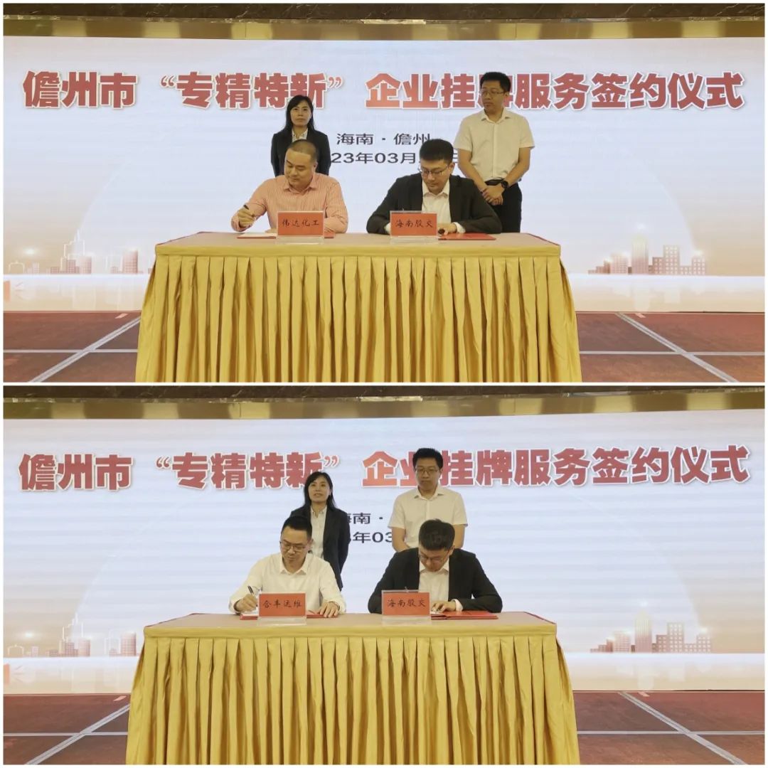 隨后,海南股交分別與儋州市“專精特新”企業代表儋州偉達化工有限公司、海南合豐運維科技有限公司兩家企業簽訂掛牌服務協議,后續將在企業改制、投融資、培訓、咨詢等方面為兩家企業提供深度服務,助力企業規范、快速發展。