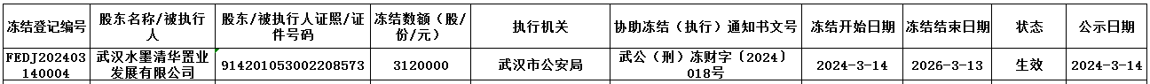 依據武漢市公安局《協助凍結財產通知書》[武公(刑)凍財字〔2024〕018號]文件,我中心為海南白沙長江村鎮銀行股份有限公司(企業代碼:893522)股東武漢水墨清華置業發展有限公司辦理股權凍結登記,具體情況如下: